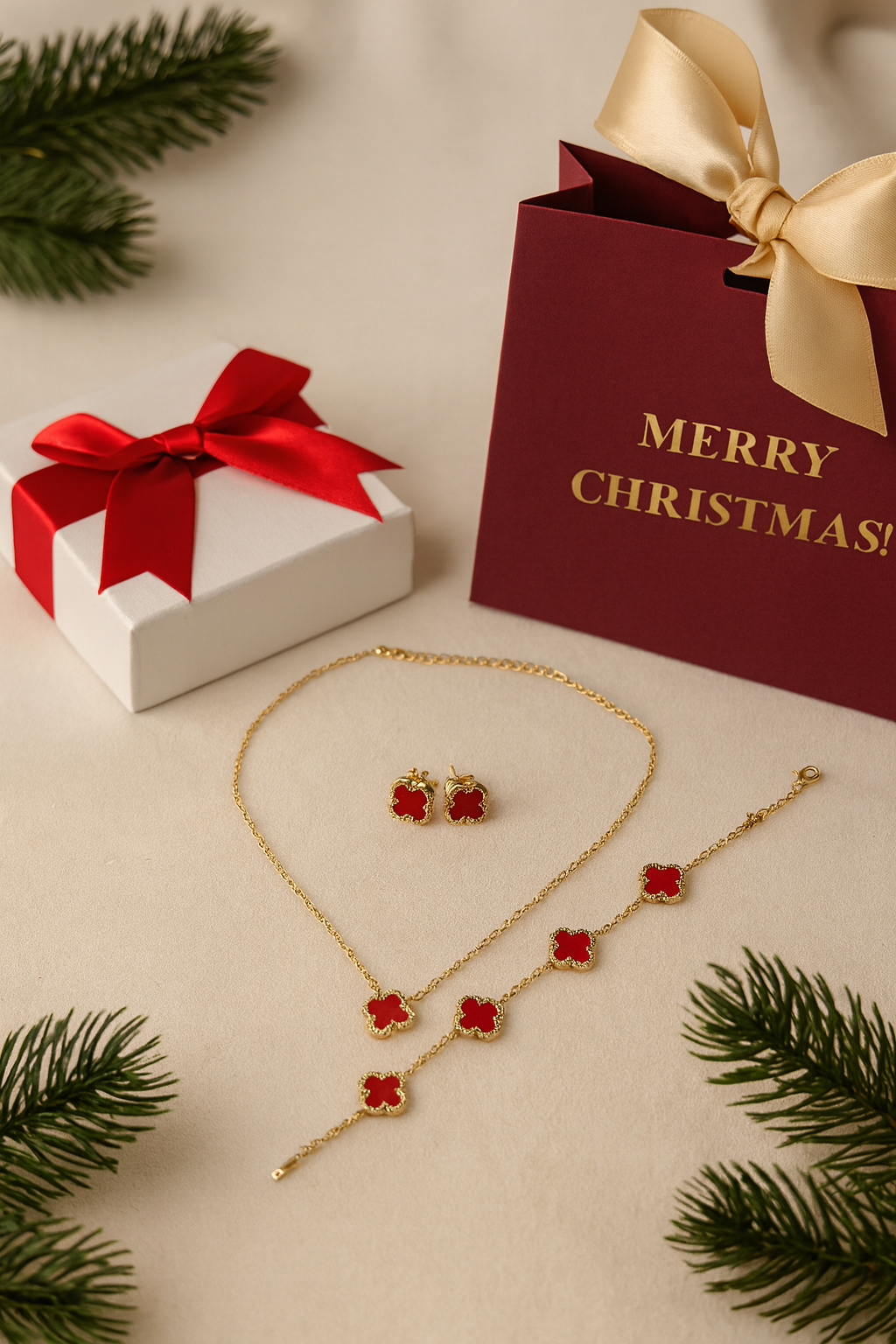 Подчертай своята изисканост с този стилен дамски комплект, вдъхновен от символиката на четирилистната детелина. Включва колие, гривна и обеци.